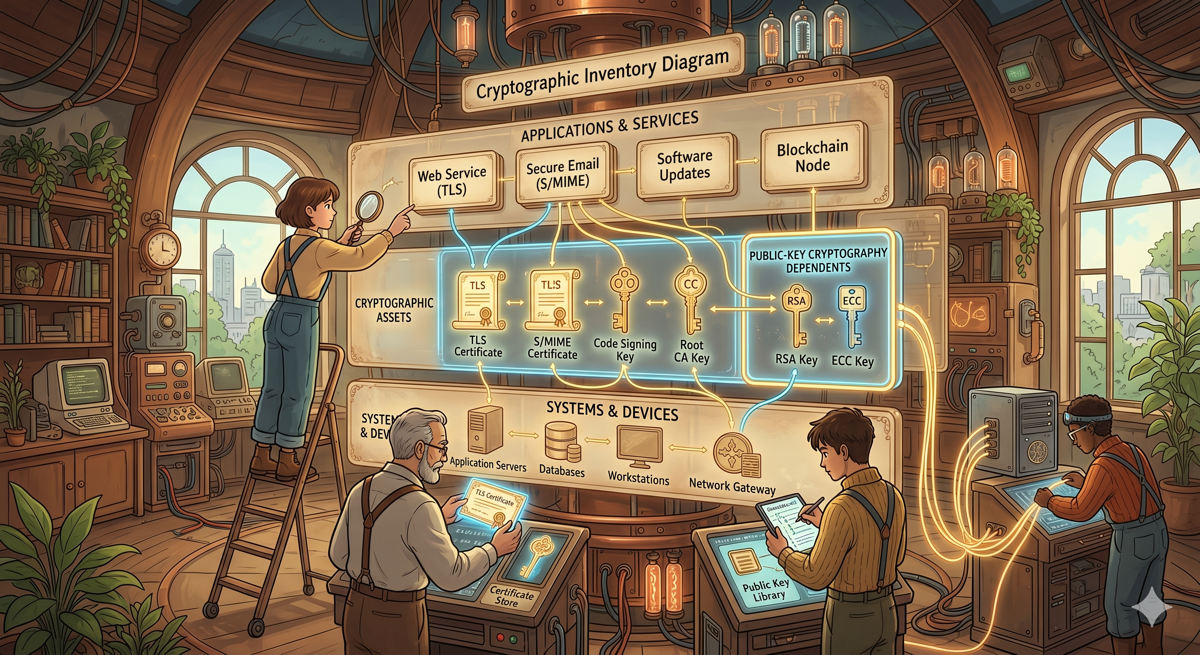 หลายองค์กรมี asset inventory พอใช้ได้ แต่ไม่มี cryptographic inventory จริง ๆ ซึ่งต่างกันพอสมควร เพราะเครื่องหนึ่งอาจมีการใช้ cryptography หลายแบบหลายชั้น และบางจุดก็ถูกซ่อนอยู่ใน dependency หรือ managed service ที่ทีมปฏิบัติการไม่เห็นตรง ๆ